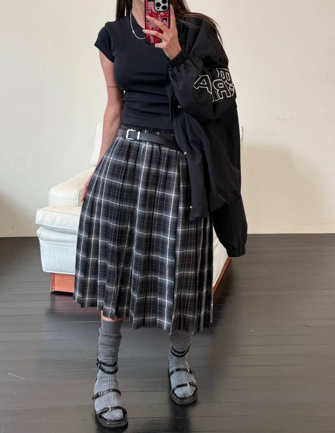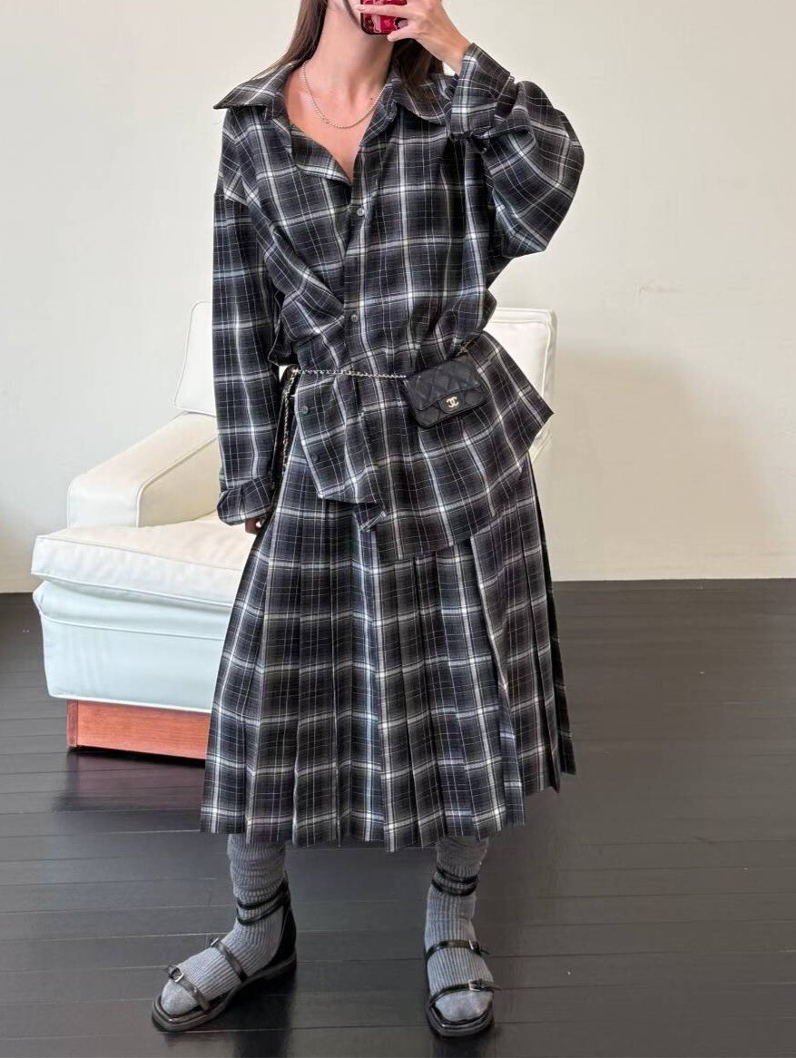 雙層褲頭百褶格紋裙