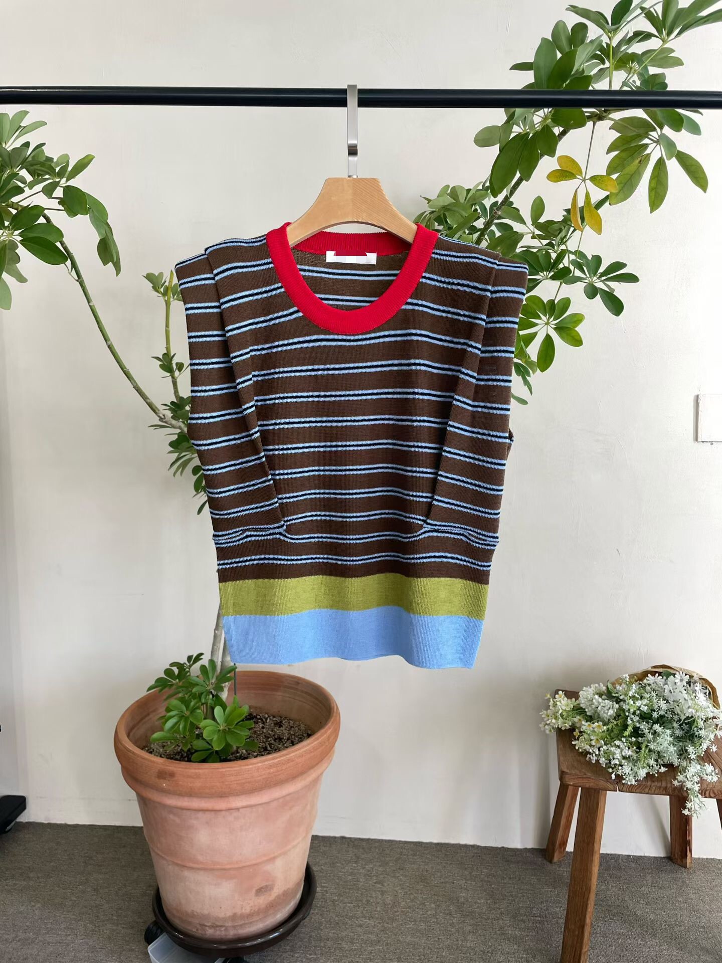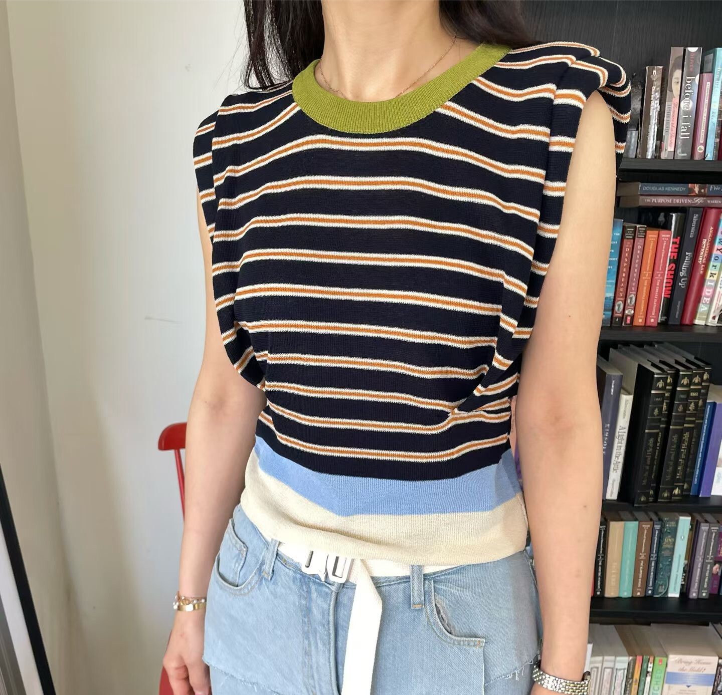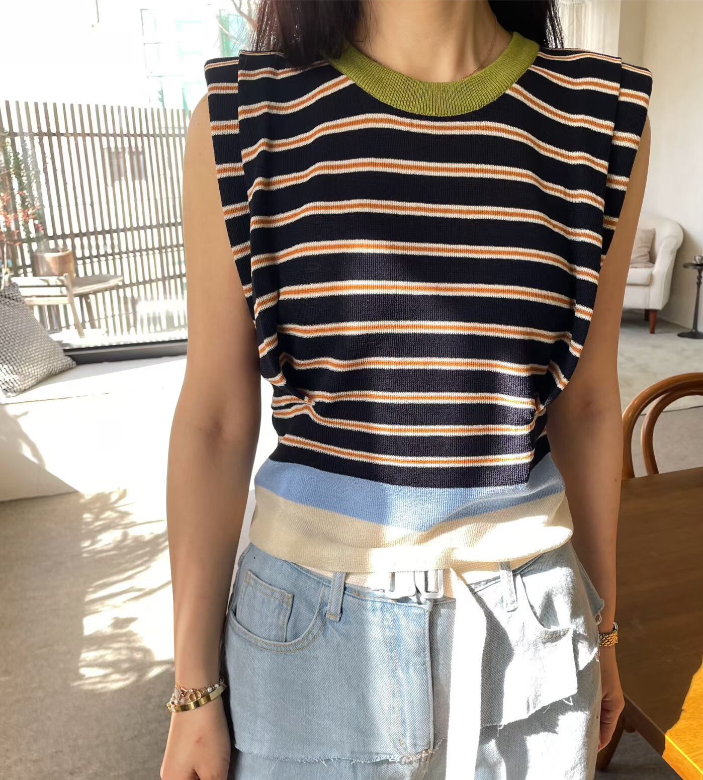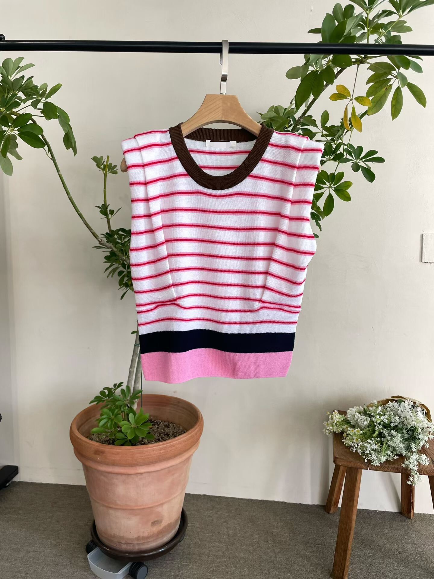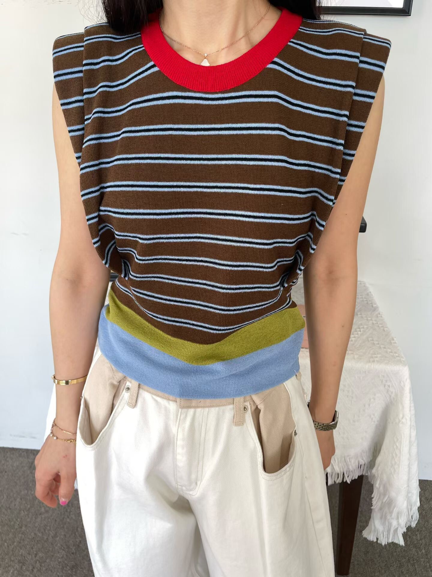 撞色收腰墊肩棉質背心