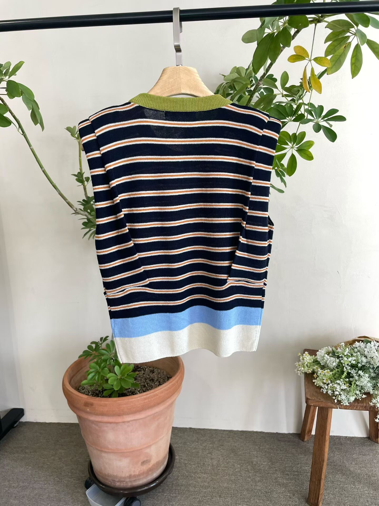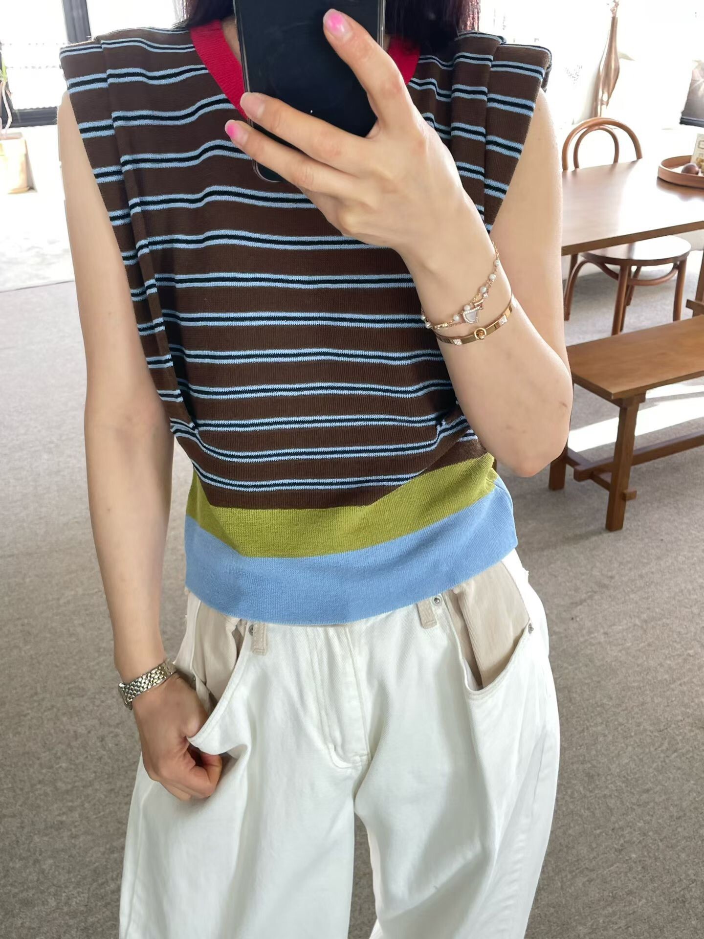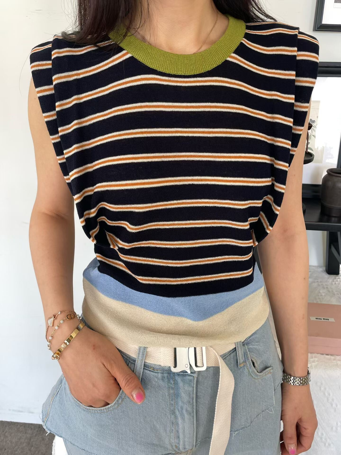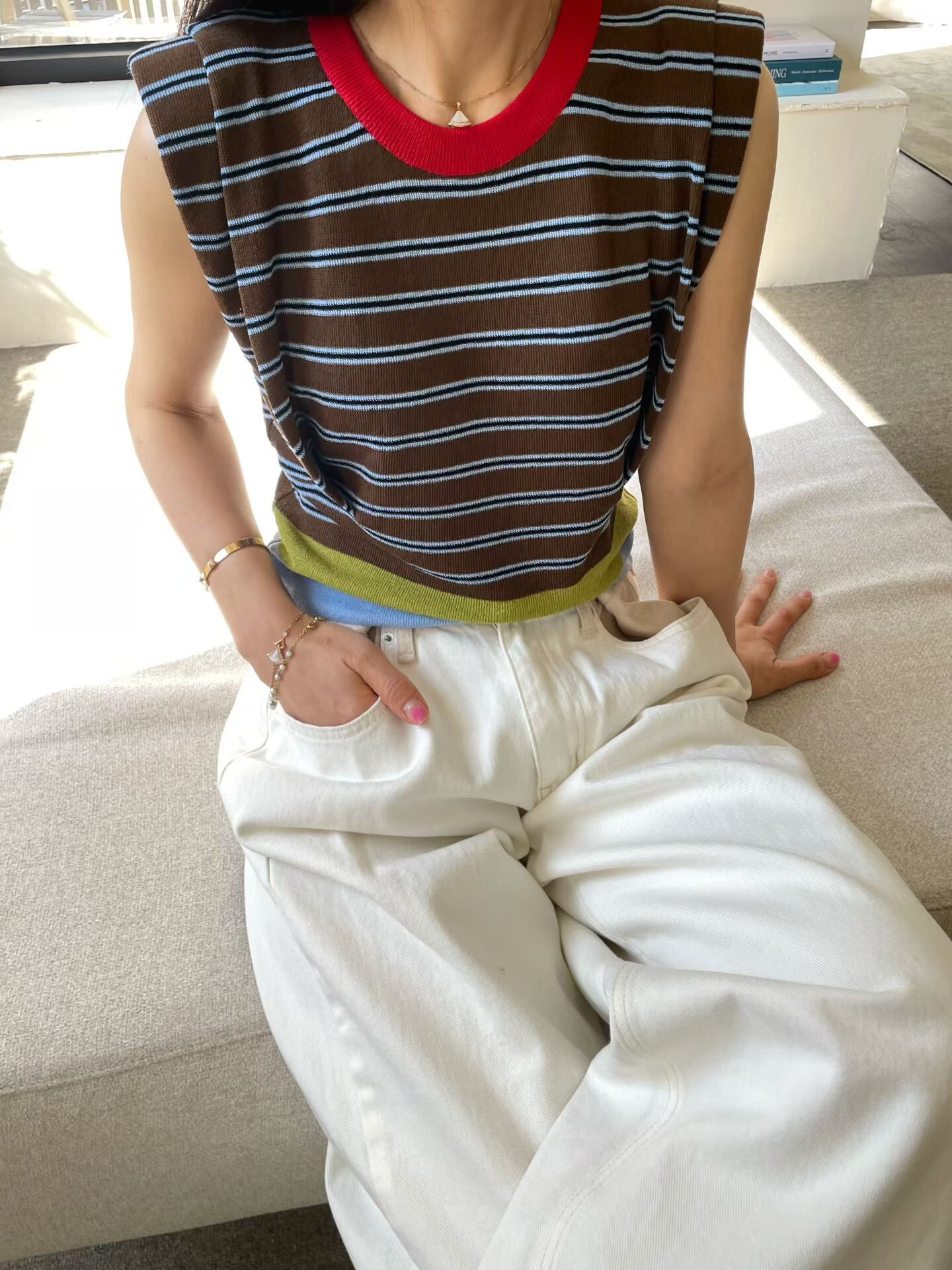 撞色收腰墊肩棉質背心
